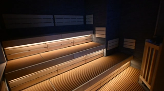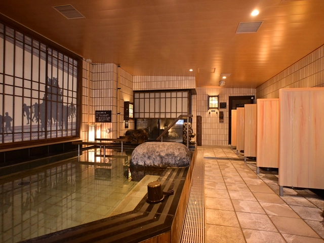 当館のお湯は、敷地内の地下900メートルから湧き出る天然温泉をそのまま汲み上げて使用しています。2Fにありながら大きな窓から緑がのぞく内湯、ならびに開放的な岩風呂でゆっくりおくつろぎください。男湯、女湯も、それぞれ内湯、外湯、高温ドライサウナ(オートロウリュ)、水風呂を設えています。