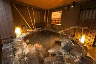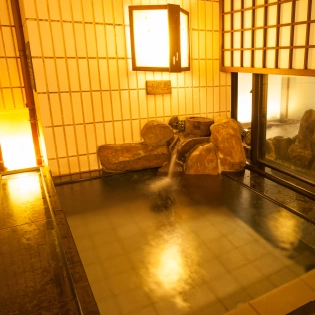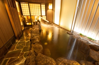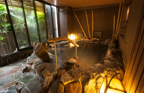 2Fに、男女別天然温泉大浴場「御笠の湯」。敷地内の地下900メートルから湧き出る天然温泉をそのまま汲み上げて使用しています。2Fにありながら、大きな窓から緑がのぞく内湯、ならびに開放的な岩風呂で、ゆっくりおくつろぎください。