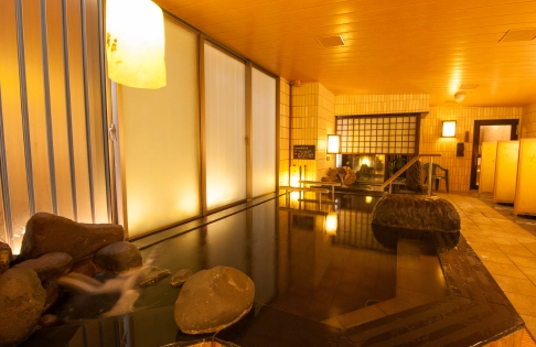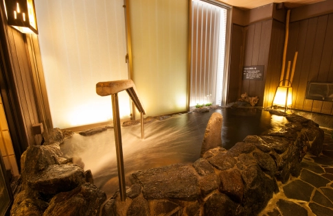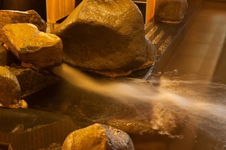 - 2Fの大浴場でありながら、レイアウトを工夫し、内湯でも日中は陽光を、露天風呂も外気を感じることができます。浴室内のレイアウト、照明などの意匠、温泉情緒溢れる石組みは、ドーミーイン各棟それぞれのお風呂づくりを支える、通称“大工さんチーム”のこだわり満載で、石組みの湯口からの流れは、ドーミーイン自慢です。