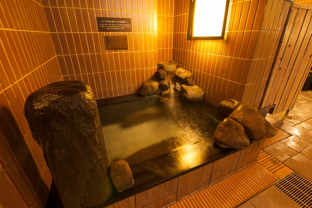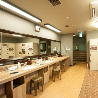 - 2Fの大浴場でありながらレイアウトを工夫し、内湯でも日中は陽光を露天風呂も外気を感じることができます。浴室内のレイアウト、照明などの意匠、温泉情緒溢れる石組みは、ドーミーイン各棟それぞれのお風呂づくりを支える通称“大工さんチーム”のこだわり満載で、石組みの湯口からの流れはドーミーイン自慢です。