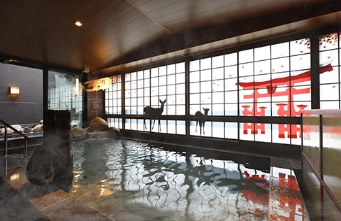 - 開口部には、陽光で安芸の宮島の風景が映し出されます。露天風呂では、眺望こそ叶いませんが、吹き抜けの空を望むと、流れる雲や夜空を眺めていただけます。外気も注ぎ込み、ゆっくりご休憩いただけると思います。お風呂アイテムは、いろいろ広島に寄っています。