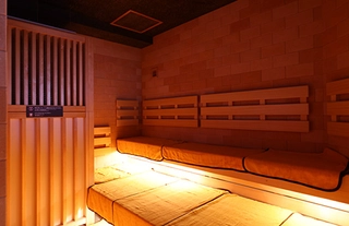 - ドライサウナは2段。熱くなった身体をチラー付き(水温を保つ装置)の水風呂で冷まし、そのあとは外湯スペースでお寛ぎください。浴室内のレイアウト、照明などの意匠、温泉情緒溢れる石組みは、ドーミーイン各棟それぞれのお風呂づくりを支える通称“大工さんチーム”のこだわり満載です。