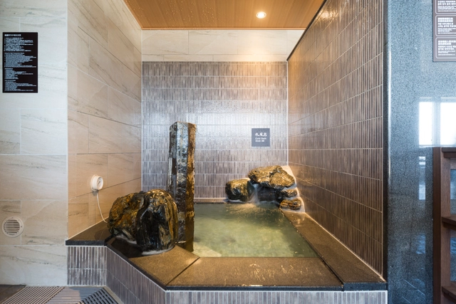 - ドライサウナは2段構造。水風呂には、ドーミーインならではの温泉風情を醸し出す石組みを。露天風呂の石組みをはじめ、浴室内のレイアウト、意匠は、ドーミーイン各棟それぞれのお風呂づくりを支える、通称“大工さんチーム”のこだわり満載です。