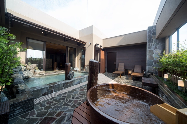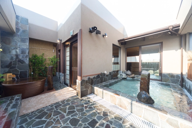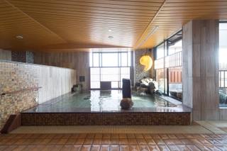 - 広い開口部からは日中は明るい陽光が注ぎこみ、湯をきらきらと照らし、また水面に反射した光が天井や、大きな勾玉の照明にゆらぎます。光を見つめながら身体をあたため、露天風呂へ…。岩風呂と1人用の壺風呂をお楽しみいただけます。まるで山の頂上から夜景を見ているよう…。
