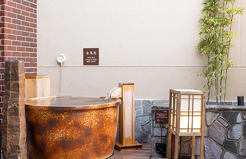 - 広い浴室、天然温泉の大きな内湯、そして露天風呂。都会ゆえ高層ビルが多く目隠しの都合上で眺望は叶いませんが、最上階ならではの空の吹き抜けがある露天風呂は自慢です。浴室内のレイアウト、照明などの意匠、温泉情緒溢れる石組みは、ドーミーイン各棟それぞれのお風呂づくりを支える通称“大工さんチーム”のこだわり満載です。