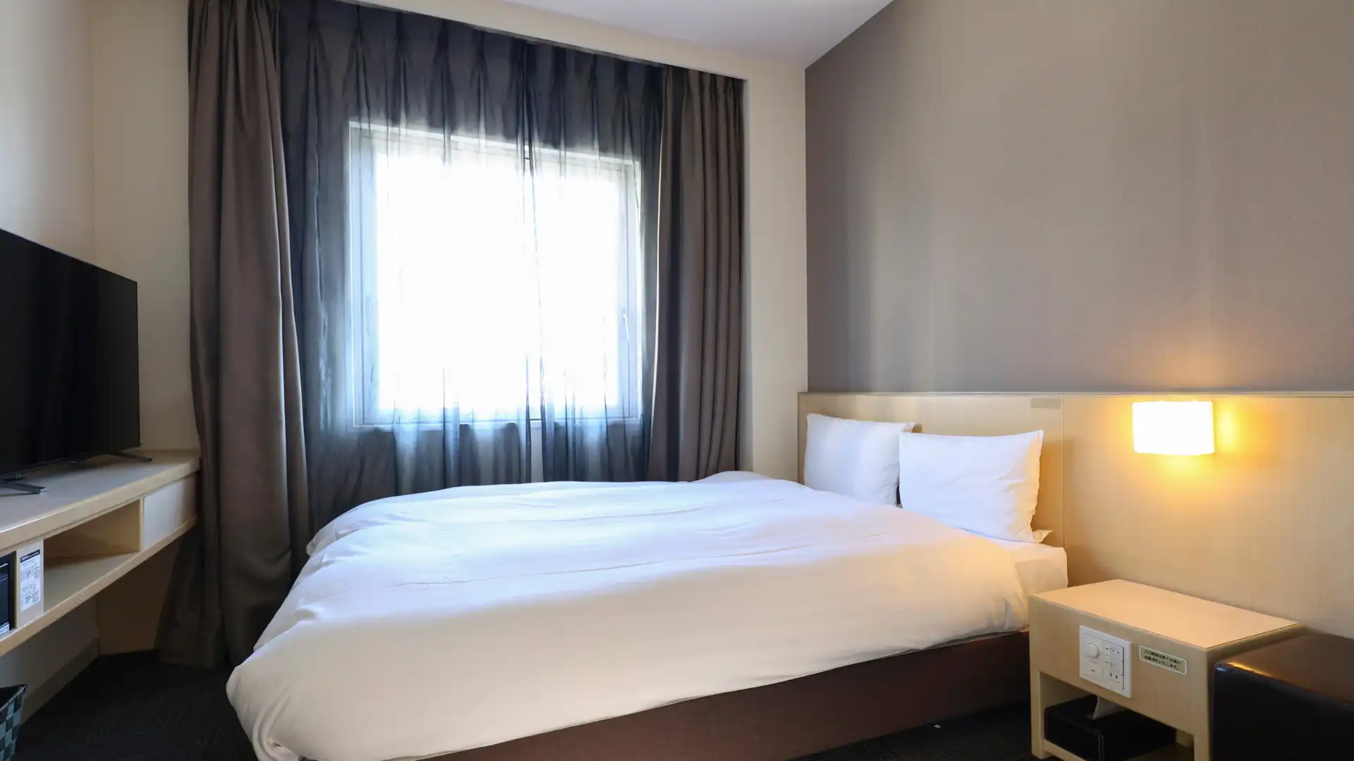 シーリングライトの明るい室内に、居室と入口を分けた引き戸でプライベート感を重視しました。お部屋タイプは、シングル、ダブル、ツイン、和室をご用意しています。