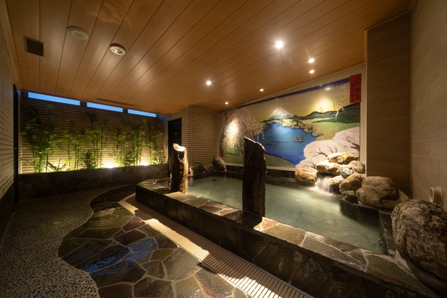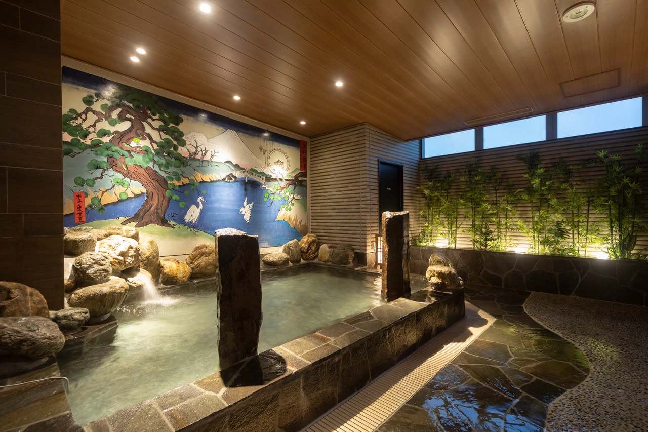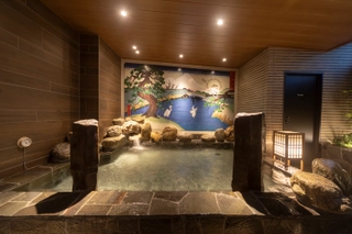 - 銭湯のような絵で、しっとりと落ちつく浴室。あつ湯とぬる湯、それぞれ大きめなので、気を使わず、ゆったり手足をのばしてお入りいただけます。地下1Fで外気浴は叶いませんが、ちょっとでも外気を取り入れる工夫を凝らしています。休憩椅子に座りながら、湯面に反射した照明が天井にゆらめく様を眺めておくつろぎください。