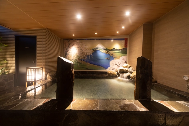 - 銭湯のような絵と、宵と明けの微妙な空を表現した壁で、しっとりと落ちつく浴室。あつ湯とぬる湯、それぞれ大きめなので、気を使わず、ゆったり手足をのばしてお入りいただけます。地下1Fで外気浴は叶いませんが、ちょっとでも外気を取り入れる工夫を凝らしています。休憩椅子に座りながら、湯面に反射した照明が天井にゆらめく様を眺めておくつろぎください。