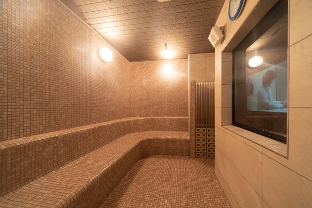 - 女性大浴場はミストサウナとなっています。広めの空間で、TVを見ながらゆっくりお入りいただけます。サウナ後は、浴室内の休憩椅子でおくつろぎを。ほのかに入る外気を感じつつ、湯面に反射した照明が天井にゆらめく様を眺めてお休みください。