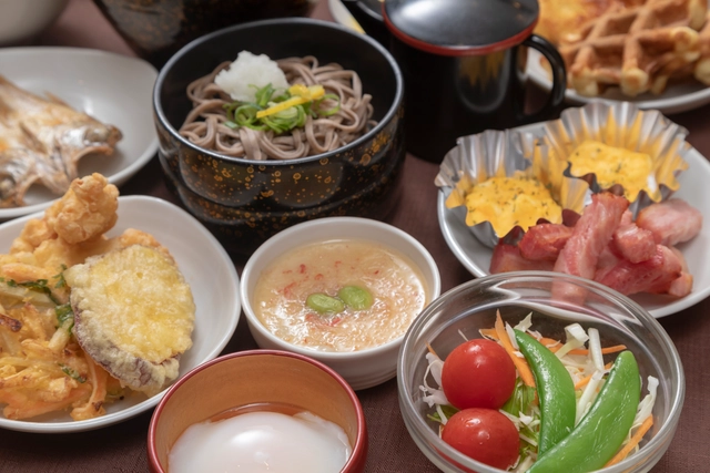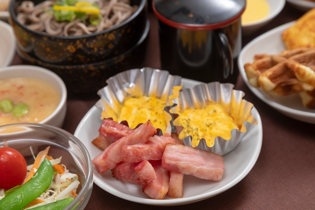 朝食は、全国のドーミーインチェーン共通の和洋バイキング、小鉢横丁と出来たての卵料理に加え、地域ごとの特色を出した「ご当地逸品料理」をご提供。温かいものは温かく、冷たいものは冷たく。いつも美味しそうに見えるように…。そんな気持ちで準備してお待ちしています。