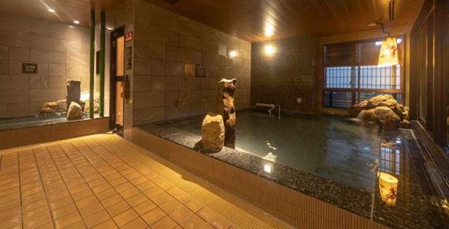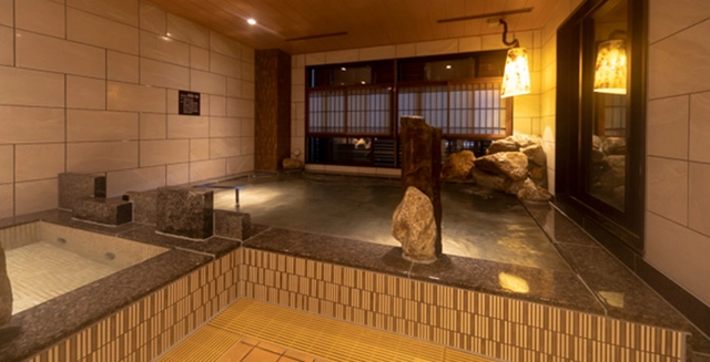最上階13Fの男女別大浴場「朝霧の湯」は、大阪市四条畷市から運んだラドン温泉で内湯を満たしています。大浴場のコンセプトは「自然」と「和」。岩や竹を使用し安らぐ空間を演出しております。最上階ならではの外気と、遠くに聞こえる都会の音をお楽しみください。