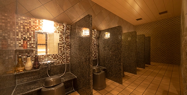 - ドライサウナは2段。熱くなった身体を、チラー付き(水温を保つ装置)の水風呂で冷まし、そのあとは、外湯スペースで、心ゆくまで外気浴を味わってください。浴室内のレイアウト、照明などの意匠、温泉情緒溢れる石組みは、ドーミーイン各棟それぞれのお風呂づくりを支える、通称“大工さんチーム”のこだわり満載です。