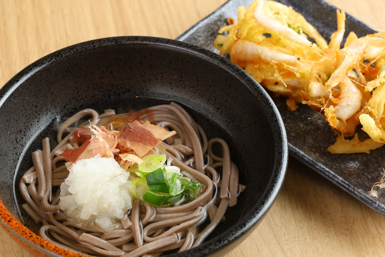 福井県を代表する名物料理「越前おろしそば」には、ねぎ・かつおぶし・おろし大根を添えてご提供いたします。
