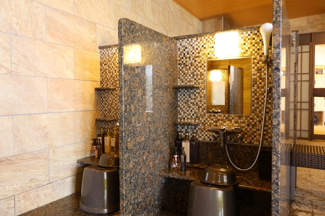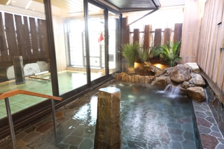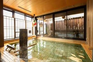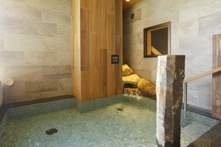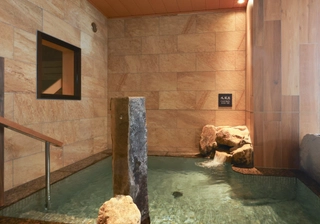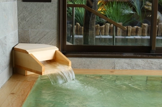 - 福井温泉自然の湯からの運び湯。清々しい桧の香りと湯船に注がれる湯の音に心癒され、深い安らぎへと誘います。