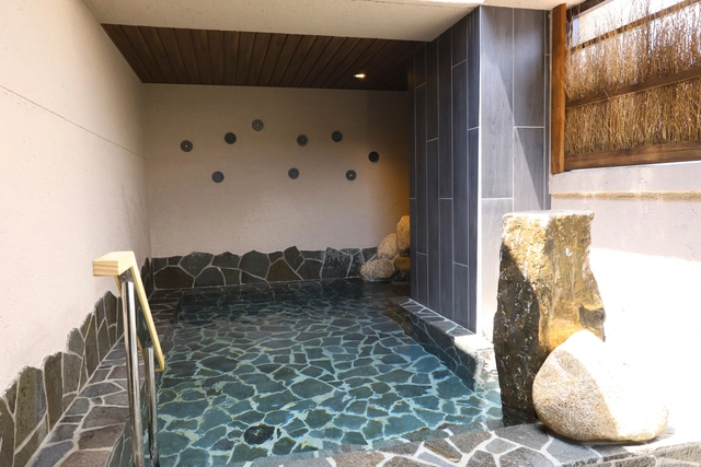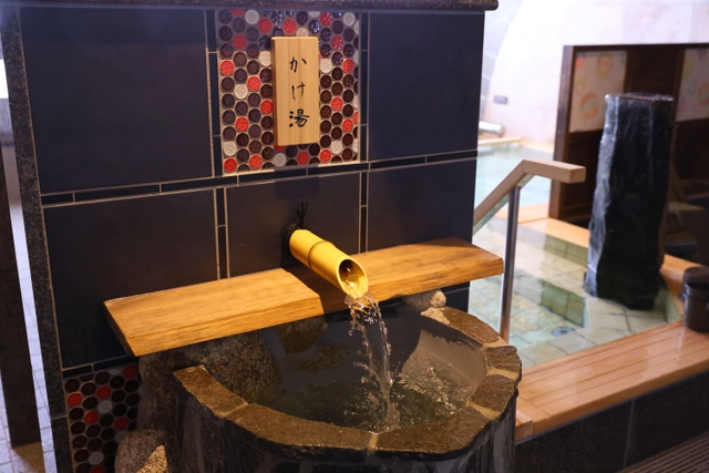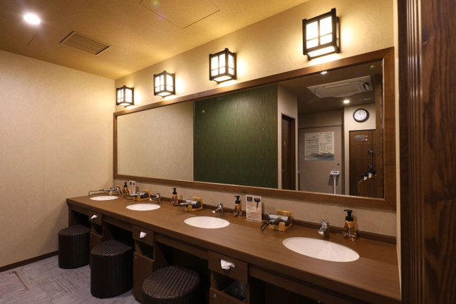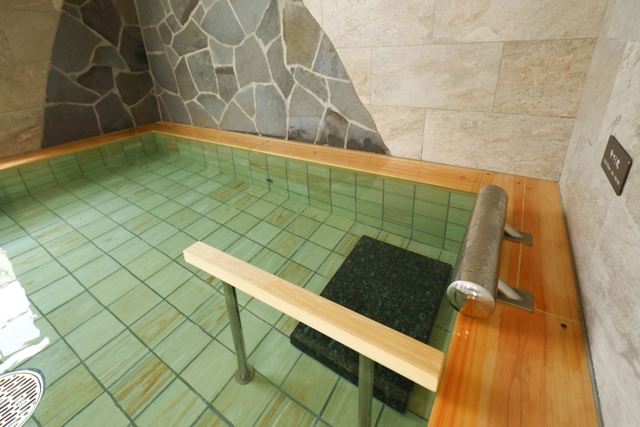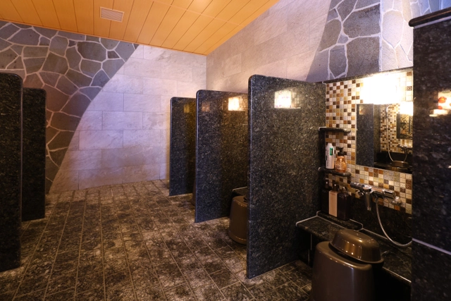 - 内湯は、熊本県山鹿市「ならのさこ温泉」からの運び湯。 熊本城をイメージした内装にもこだわっています。