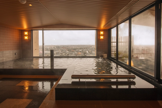 最上階12Fに、男女別天然温泉大浴場「夕凪の湯」。内湯は、敷地から湧き出る自家源泉です。その内湯と露天風呂からは、境港の町並み、そして奇跡的な位置関係によって、遙か先にそびえる名峰「大山(だいせん)」が日本海ごしに望みます。