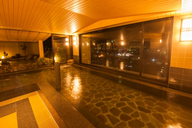 - 内湯の広い開口部からは日中は素晴らしい眺望を望み、明るい陽光が湯をきらきらと照らし、また水面に反射した光が天井にゆらぎます。そして露天風呂からの見晴らしも良く、外気で全身を包まれる気持ちよさを感じてくださいませ。