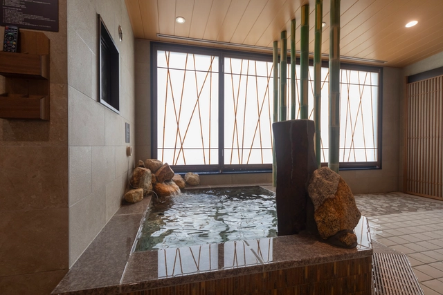 - TV付きドライサウナは2段。そして、チラー付きの(水温を保つ装置)水風呂で身体を冷まし…。浴室内のレイアウト、照明などの意匠、温泉情緒溢れる石組みは、ドーミーイン各棟それぞれのお風呂づくりを支える、通称“大工さんチーム”のこだわり満載です。