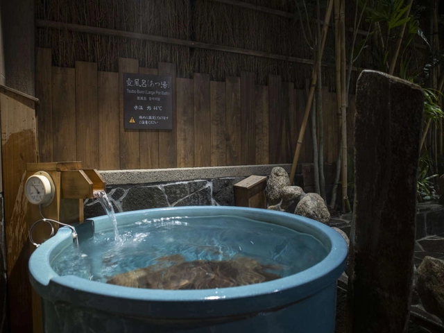 - 広い開口部からは日中は明るい陽光が注ぎこみ、湯をきらきらと照らし、また水面に反射した光が天井にゆらぎます。広々した外湯のスペースでは、露天風呂と休憩用ベンチも。腕利きの職人さんがこだわって剪定をしている露天植栽の中、晴れた日の夜には美しい満点の星々が望められ、そのまま鶴のように天高く舞いあがれそうな気がします。