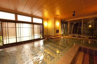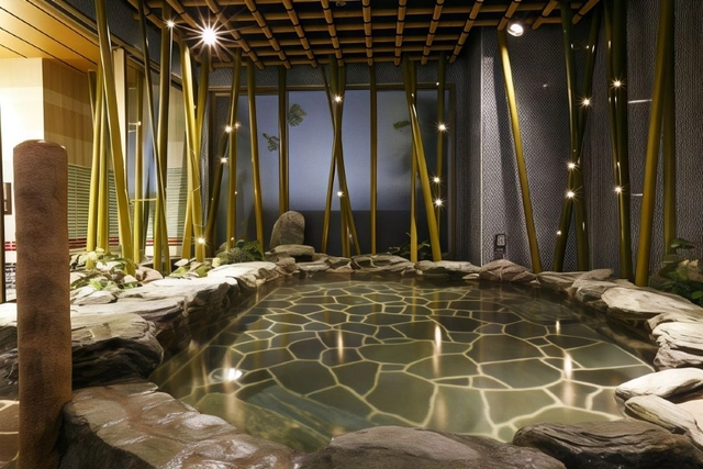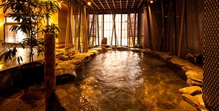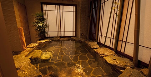2Fの男女別天然温泉大浴場「夕霧の湯」の内湯は、大阪府四條畷市から運び込む天然のラドン温泉となっています。外気浴(岩風呂)には蛍の光をイメージした装飾で、大阪の中心部にいながら温泉地にきた感覚を味わっていただくことができます。