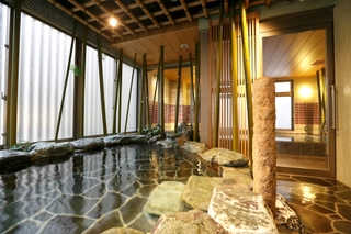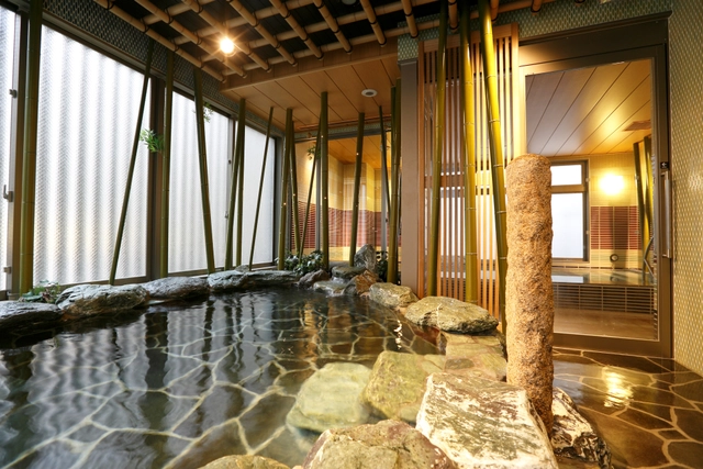 2Fの男女別天然温泉大浴場「夕霧の湯」の内湯は、大阪府四條畷市から運び込む天然のラドン温泉となっています。外気浴(岩風呂)には蛍の光をイメージした装飾で、大阪の中心部にいながら温泉地にきた感覚を味わっていただくことができます。