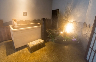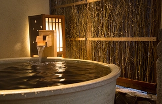 - 外湯は、岩風呂を基調とし緑豊かな植栽をあしらっており、立山の大自然に抱かれているような風情を感じていただけます。外気浴スペースにある1人用の壺湯で、ゆっくり贅沢な溢れ湯をお楽しみください。