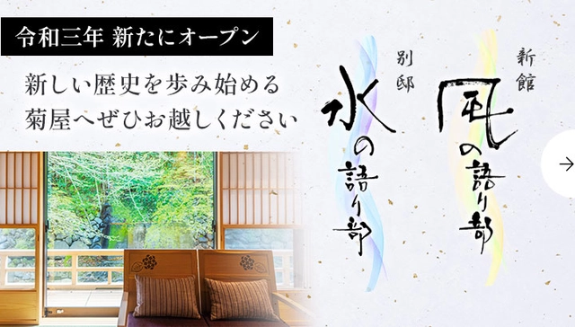 時代ごとに異なる建築様式、折々の寛ぎ。本館や離れの他、新館と別邸が新たにオープンいたしました。それぞれ趣き異なる歴史の語り部で、優雅なひと時をお過ごしください。