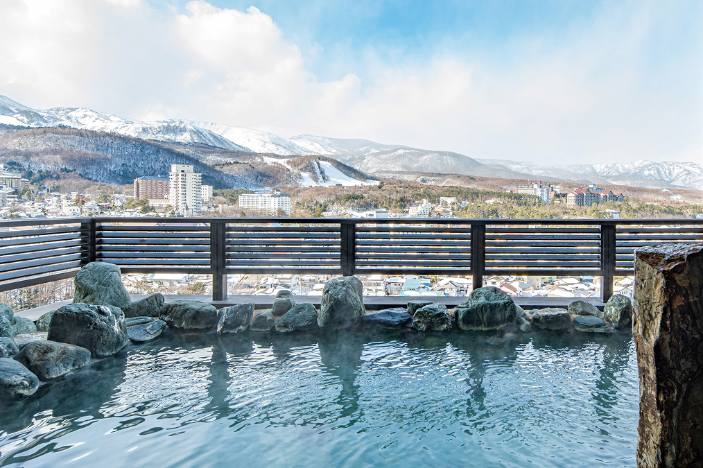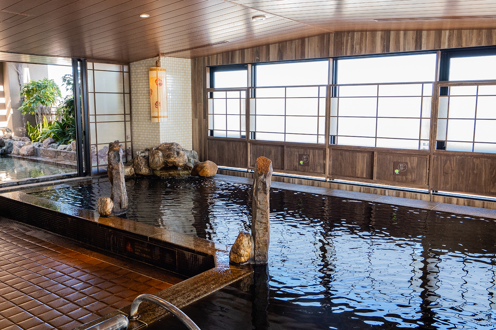10階に位置する天然温泉大浴場「越前の湯」は、福井市内を一望できる最上階ならではの解放感。