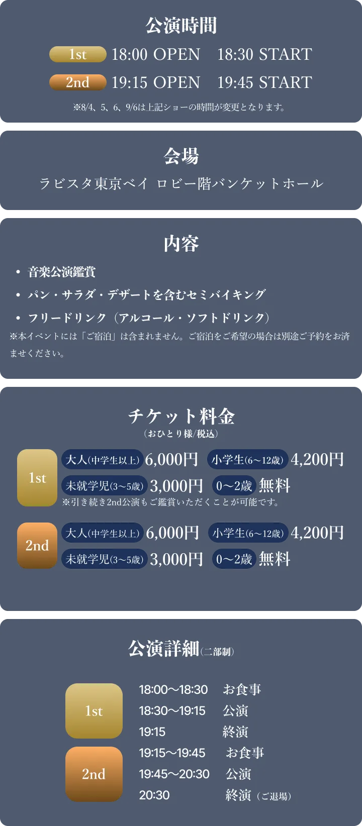 ※8/4、5、6、9/6は上記ショーの時間が変更となります。