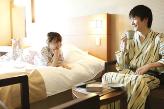 客室は寝室と居室を別々にご用意した、ゆったりした設え。全室天然温泉の客室露天風呂付きの落ち着いた和風の設えの中で、ごゆっくりおくつろぎください。