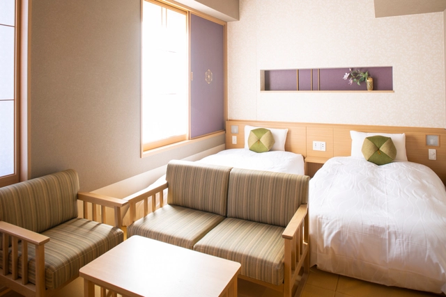 お部屋は京都の茶室で用いられる花や庭で咲き誇る草木をモチーフにしました。全室に全米ホテルシェアNo.1のサータ社製ベッド採用で上質な眠りにこだわっています。お部屋タイプは、ダブル、ツイン、ハリウッドツイン、クイーン、トリプル、ファミリー、ユニバーサルルームをご用意しています。