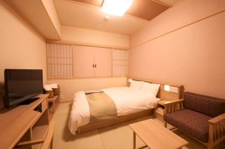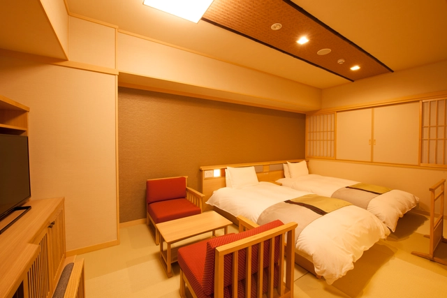 館内とともに、全館畳敷きの客室は、全米ホテルシェアNo.1のサータ社製ベッド採用で上質な眠りにこだわりました。お部屋タイプは、モデレートダブル、モデレートツイン、スーペリアツイン、ユニバーサルルームをご用意しています。