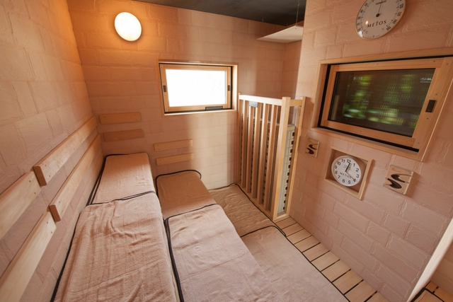 内湯は、敷地から湧き出る自家源泉です。その内湯と露天風呂からは、境港の町並み、そして奇跡的な位置関係によって、日本海ごしに遙か先にそびえる名峰「大山(だいせん)」を望みます。晴天の日に約40Km先の山頂を拝めた時は、清掃中のスタッフも一瞬手が止まってしまいます。日帰りで温泉、サウナのみのご利用も可能です(一部時間帯限定)。