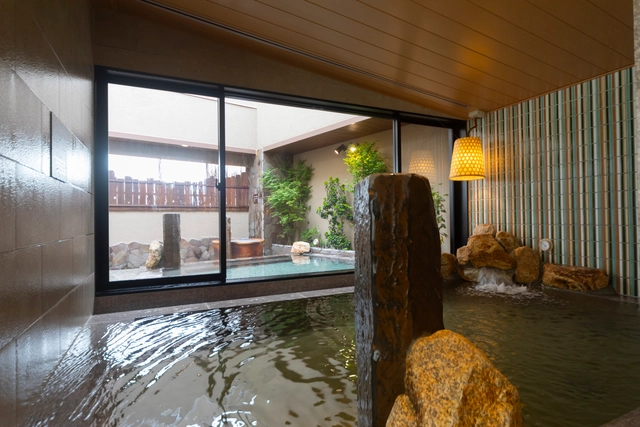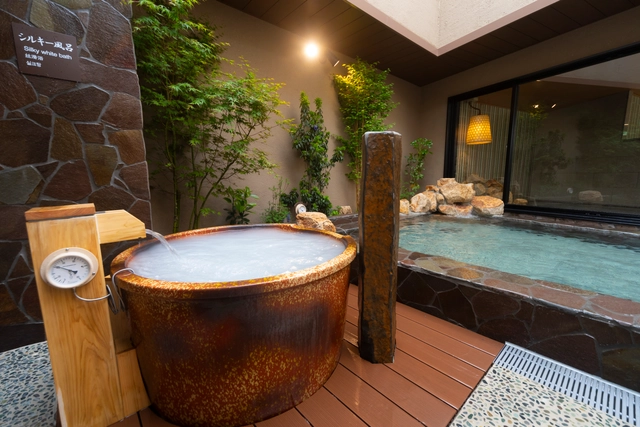 内湯は、源泉数、湧出量共に日本一の別府温泉からの運び湯です。泉質も単純温泉のため、刺激が小さく、お子様からお年寄りまで安心して入れる温泉です。露天風呂では、心地よい外気が流れており、休憩用の椅子に加えてベンチもございます。また、壺風呂(シルキー)は1人でゆったり入れるため、人気となっています。