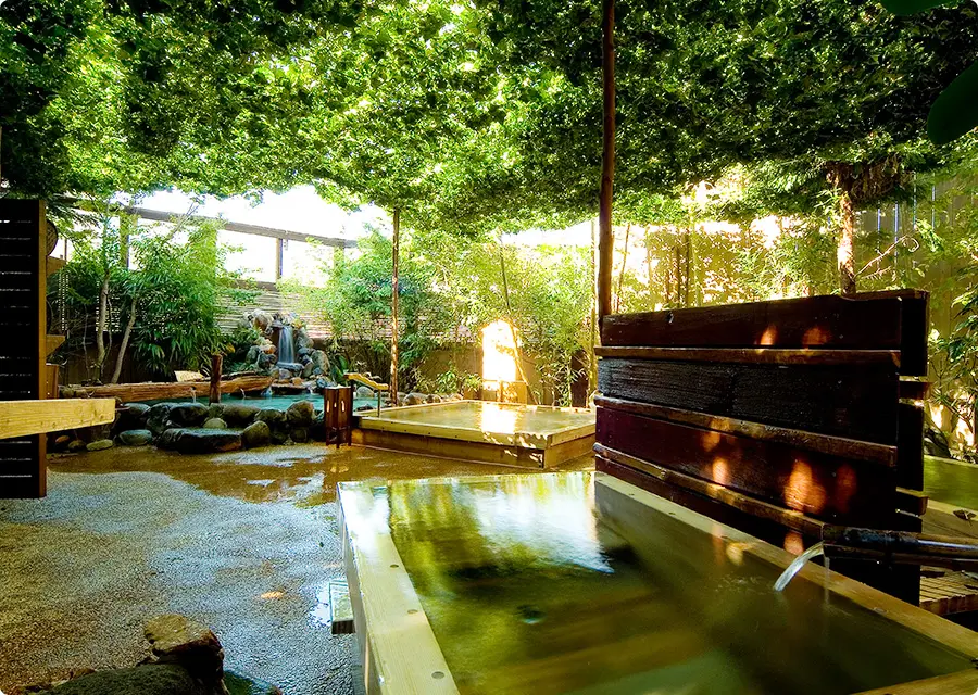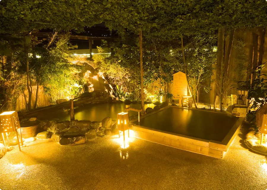 青々と茂る植物に囲まれた露天風呂や、清潔感のある大理石造りの露天風呂など、男女入れ替え制にて多彩な浴槽での湯浴みをお愉しみいただけます。