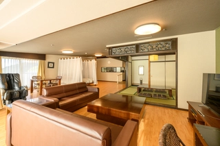 客室は全室2〜3LDKの大空間。30畳を超えるリビングの他に和室と洋室を備えております。ご家族やグループみんなで愉しみ、のびのびとお寛ぎいただけるお部屋です。