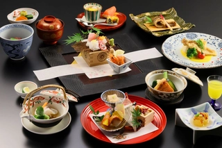 ご夕食はお好きな料理をお選びいただける「趣肴会席」。海の幸と山の幸に恵まれた修善寺ならではの旬の食材を使ったお料理をご賞味ください。