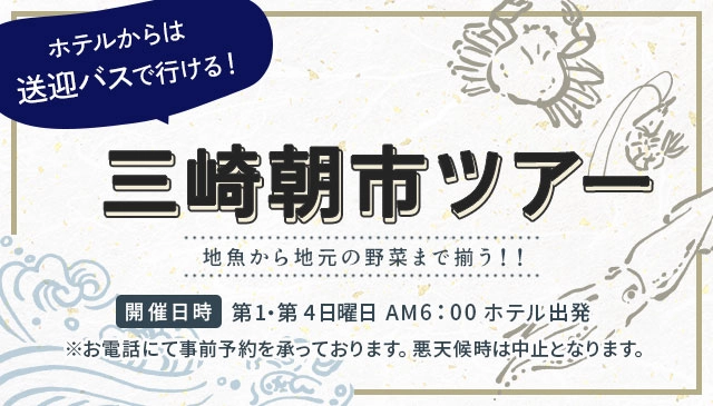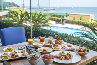東京湾や相模湾の魚介や三浦の野菜など四季折々の地元産食材にこだわり、夜はコース料理を、朝は自慢の和洋バイキングをお愉しみいただけます。