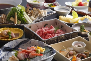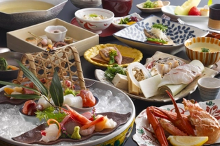 夕食の創作会席に使われる海の幸は、宿近くの津居山港に水揚げされた旬のものばかり。冬は松葉ガニのフルコースもお目見えします。プライベート感を大切にしたお席でごゆっくりどうぞ。